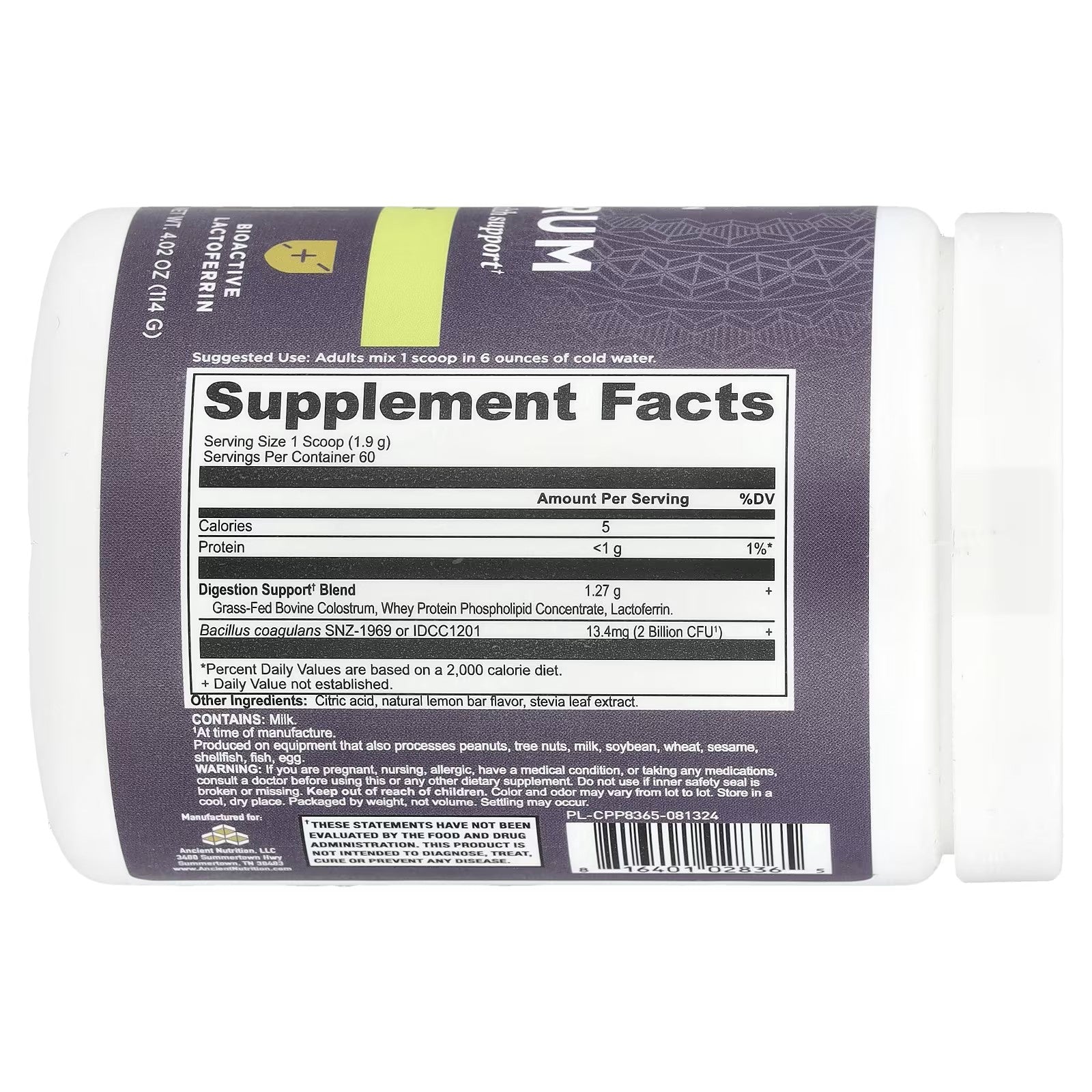 Ancient Nutrition Colostrum Powder - 60 Servings Lemon Bar 4.02 oz