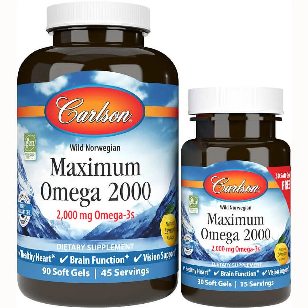 Maximum Omega 2000 provides 2,000 mg of omega-3s per serving, including 1,250 mg of EPA and 500 mg of DHA, which support heart, brain, vision, and joint health. To ensure freshness, Maximum Omega 2000 is closely managed from sea to store. We source the highest quality, deep, cold water fish using traditional, sustainable methods. Our fish are then transported to a highly regulated facility for processing and purification. Maximum Omega 2000 is encapsulated and tested by an FDA-registered laboratory for freshness, potency, and purity. Support your body with the omega-3s it needs for optimal health with Carlson Maximum Omega 2000.